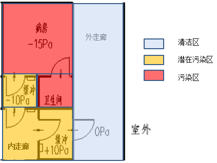 簡易負壓隔離病房區域應嚴格實施醫患分區,結合衛生安全等級分為清潔區、潛在污染區、污染區,相鄰區域之間應設置相應的緩沖間。清潔區指醫護工作區域,包括辦公、會診、治療、護士站等用房;潛在污染區指內走廊和緩沖間等區域;污染區指病房房,包括病房內的衛生間。從清潔區到潛在污染區、從潛在污染區到污染區均應設置緩沖間, 緩沖間面積不應小于3m2。