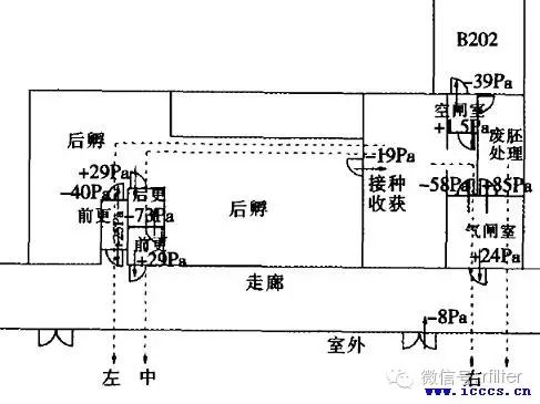 (→表示氣流方向,如“-19Pa” 表示接種室對其鄰室后孵為-19Pa,氣流從后孵至接種)