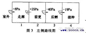 ① 選擇自壓力最高或最低的房間逐間相通地直至室外的路線如圖1所示:以第5間為準,則5、4、3、2、1或以第6間為準,則6、7。
